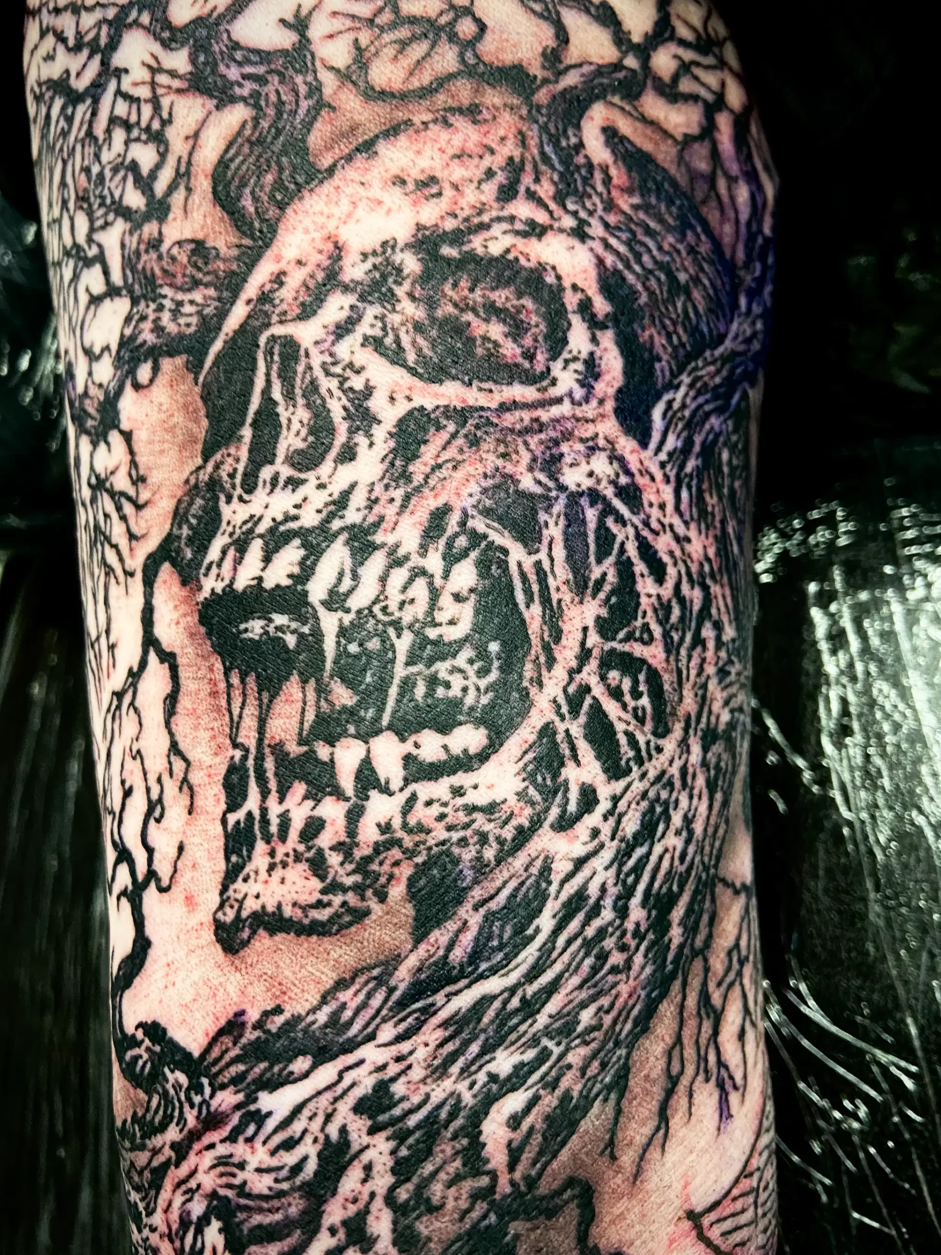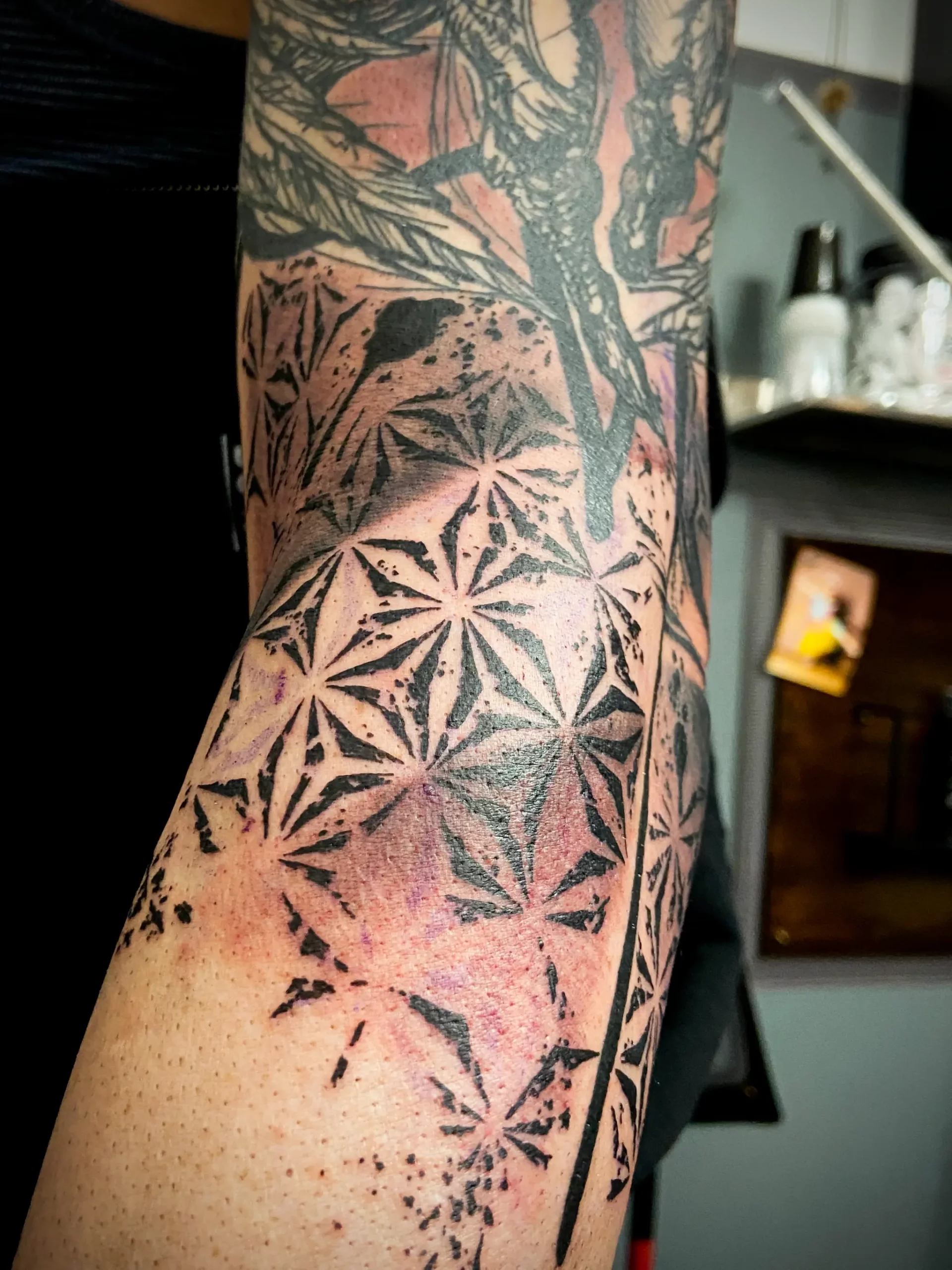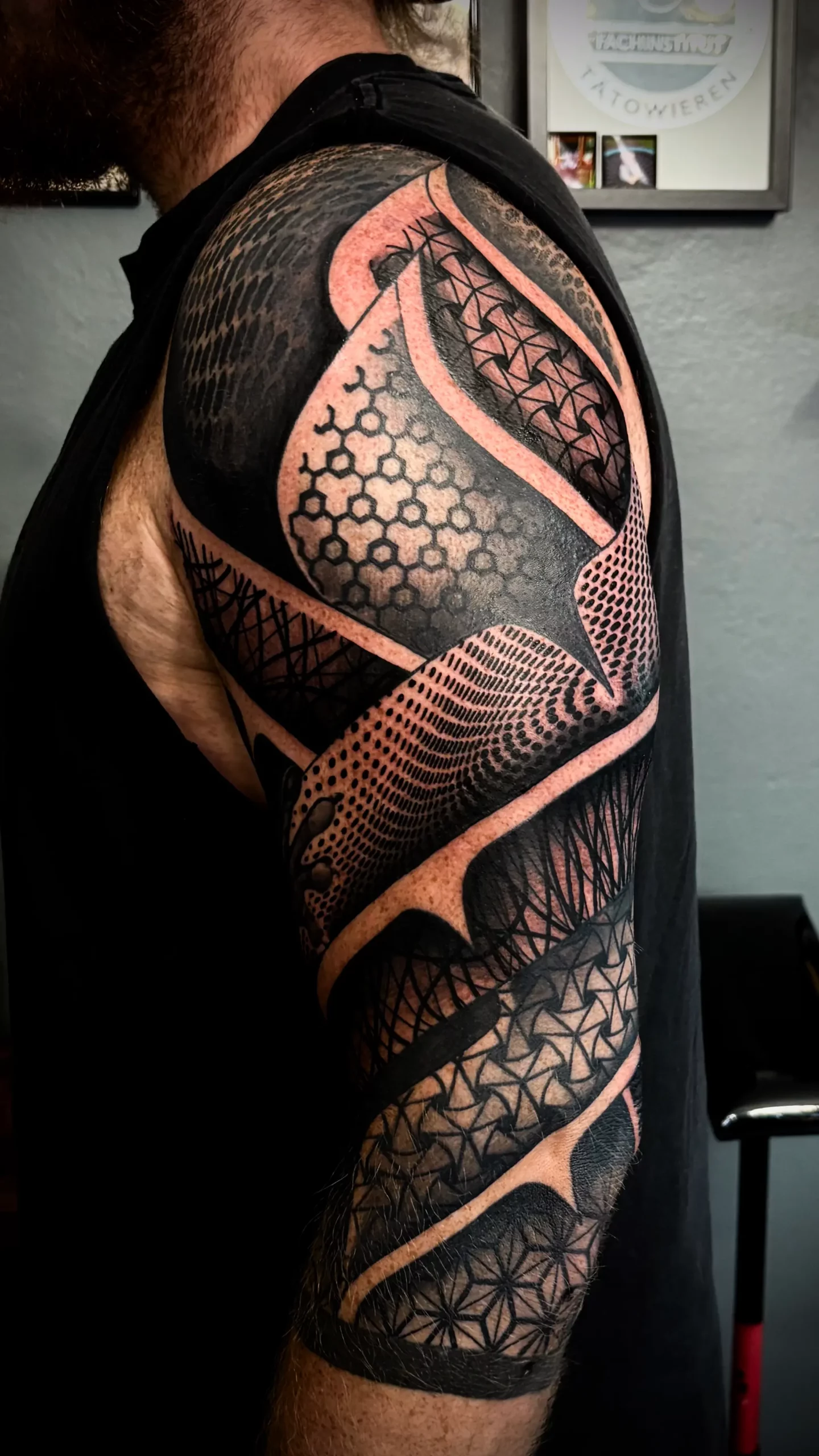 blackwork, dotwork, old school, trash polka, geo-realistic